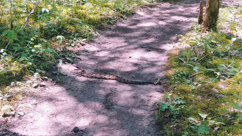 When we lived in Tennessee we used to walk the roughly five mile Hidden Springs Trail at Cedars of Lebanon State Park. One day we were about four miles in when we came across a rattlesnake lying in our path. We tried reasoning with him but after some negotiation we agreed to backtrack and thus completed eight miles of our five mile route.
